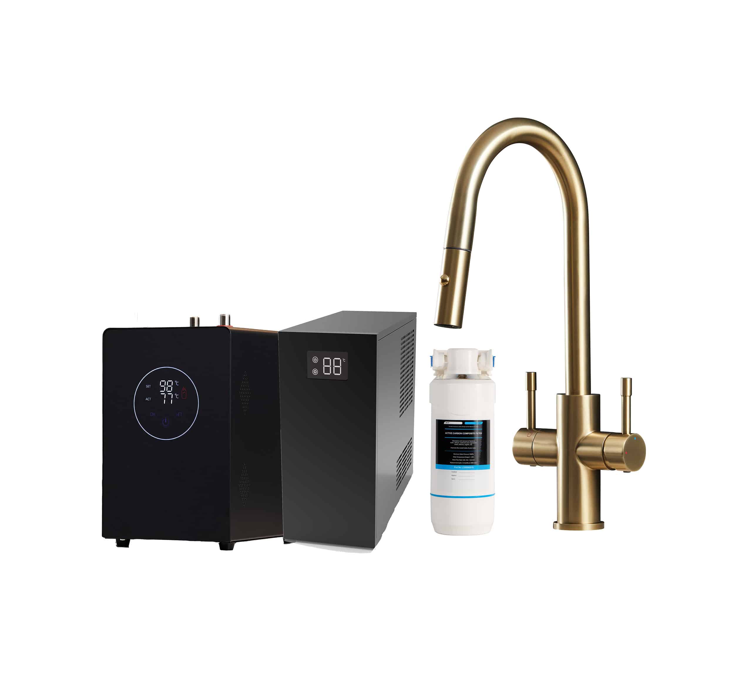 4-in-1 Swan Neck Instant Hot & Chilled Water Tap with Digital Tank, Chiller Unit, Filter & Pull-Out Spout – Brushed Gold