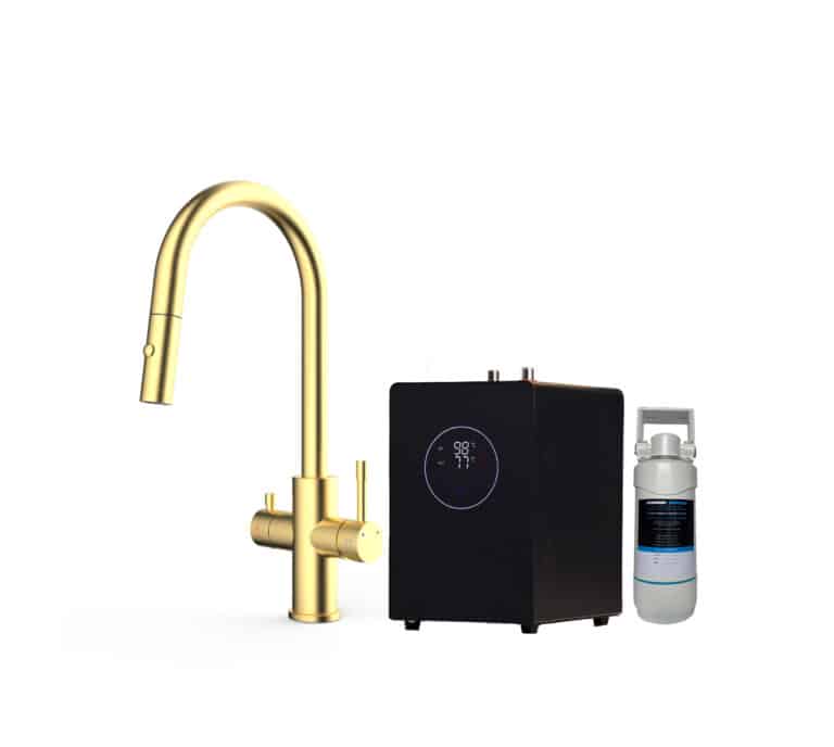 4-in-1 Swan Neck Instant Hot Water Tap with Digital Tank, Filter & Pull-Out Spout – Brushed Gold
